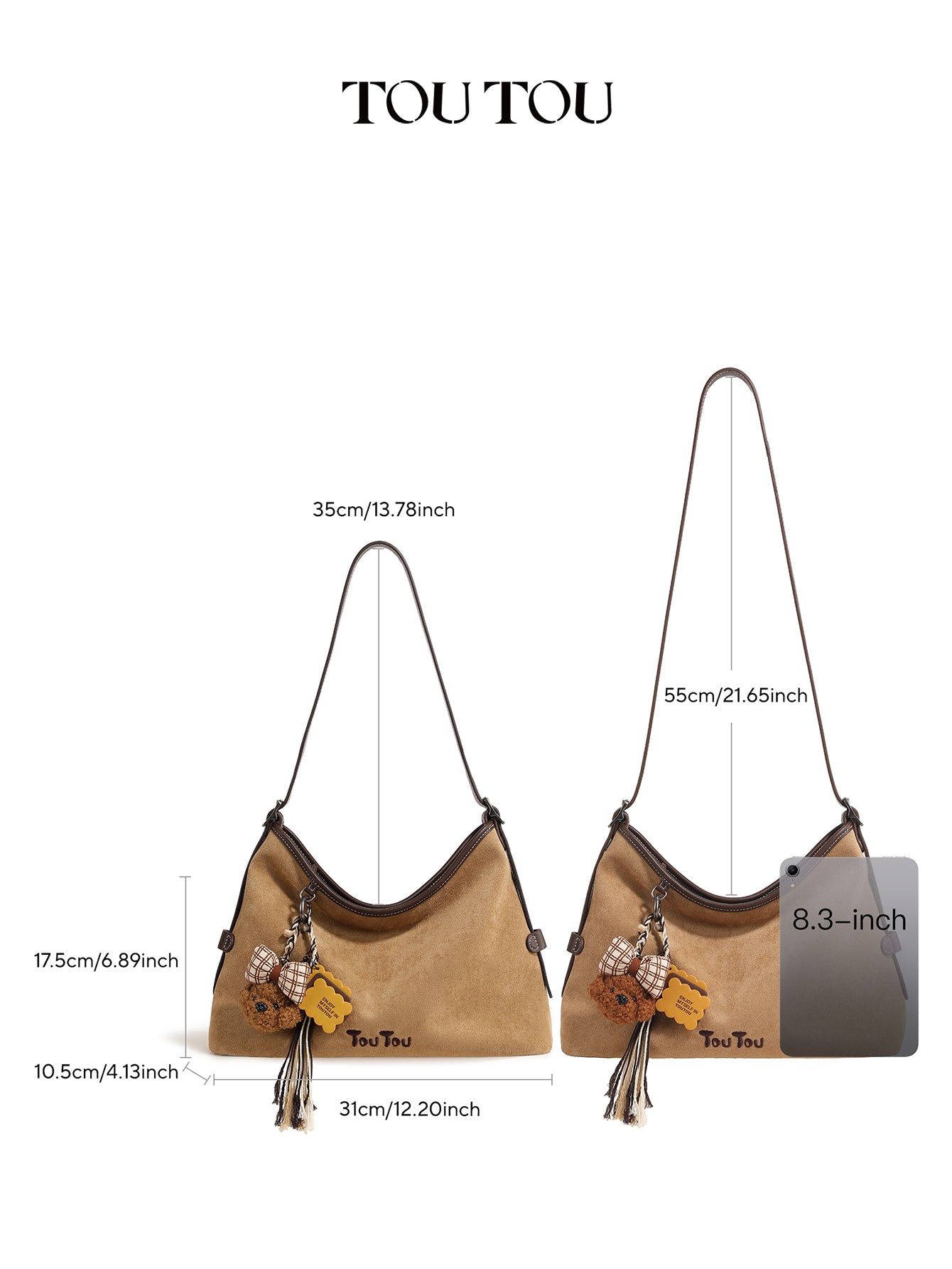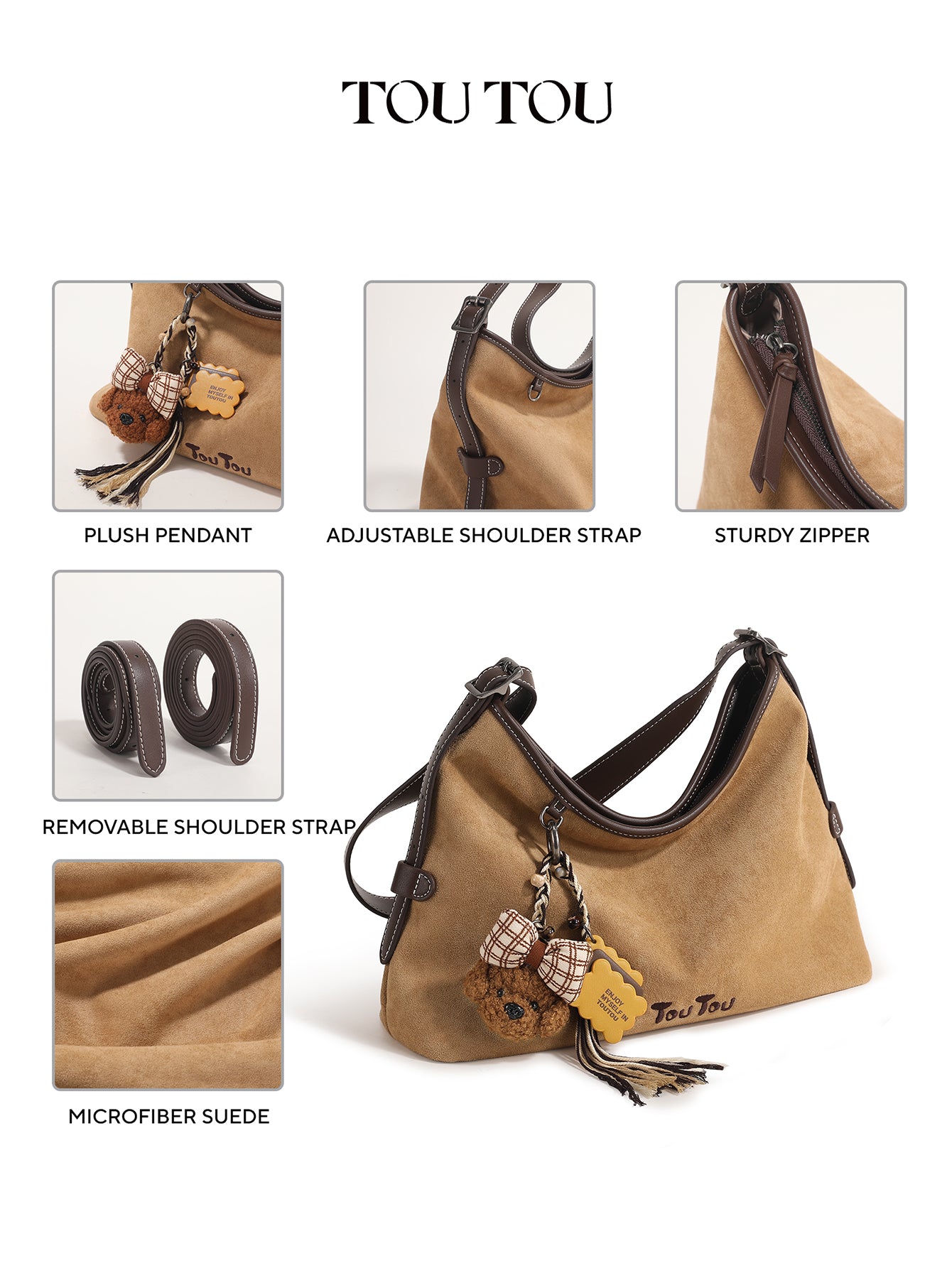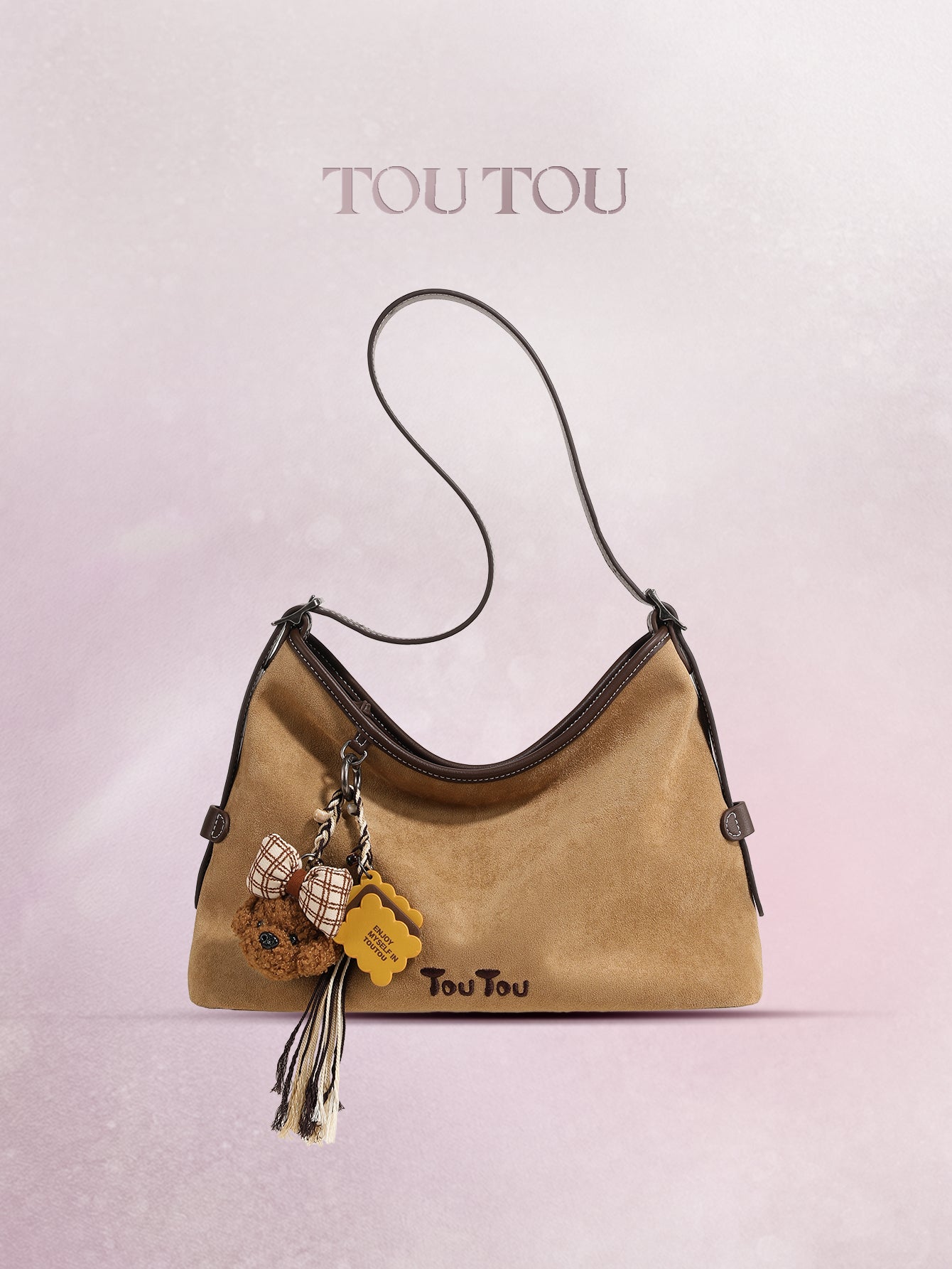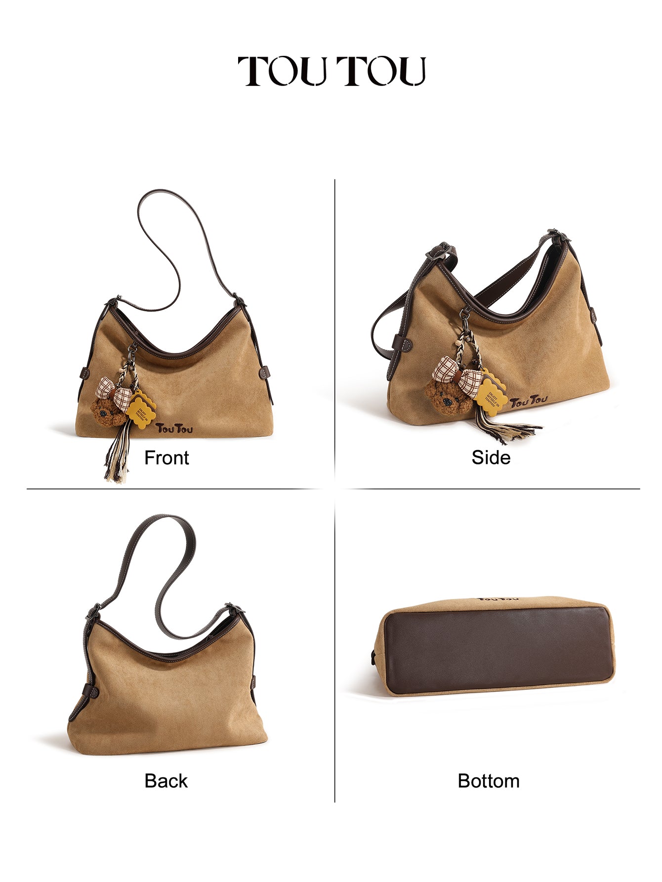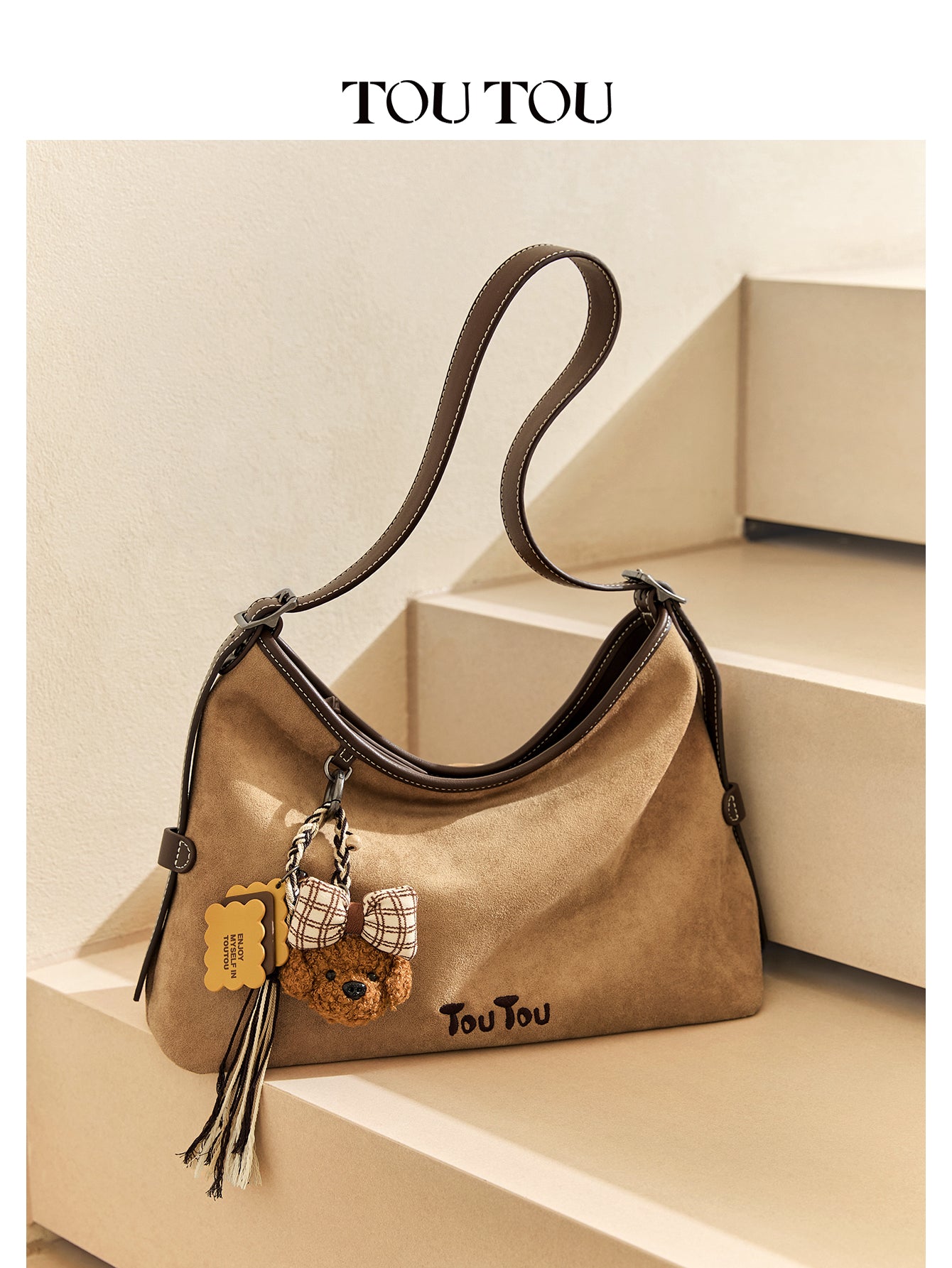 TOUTOU Beige Hobo Bag with Plush Bear Pendant: Timeless Cuteness