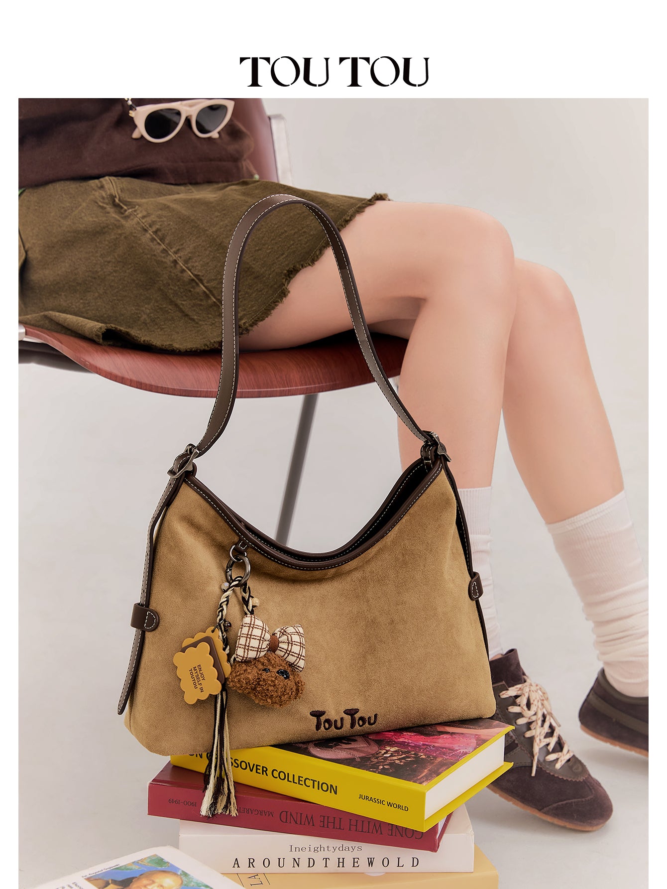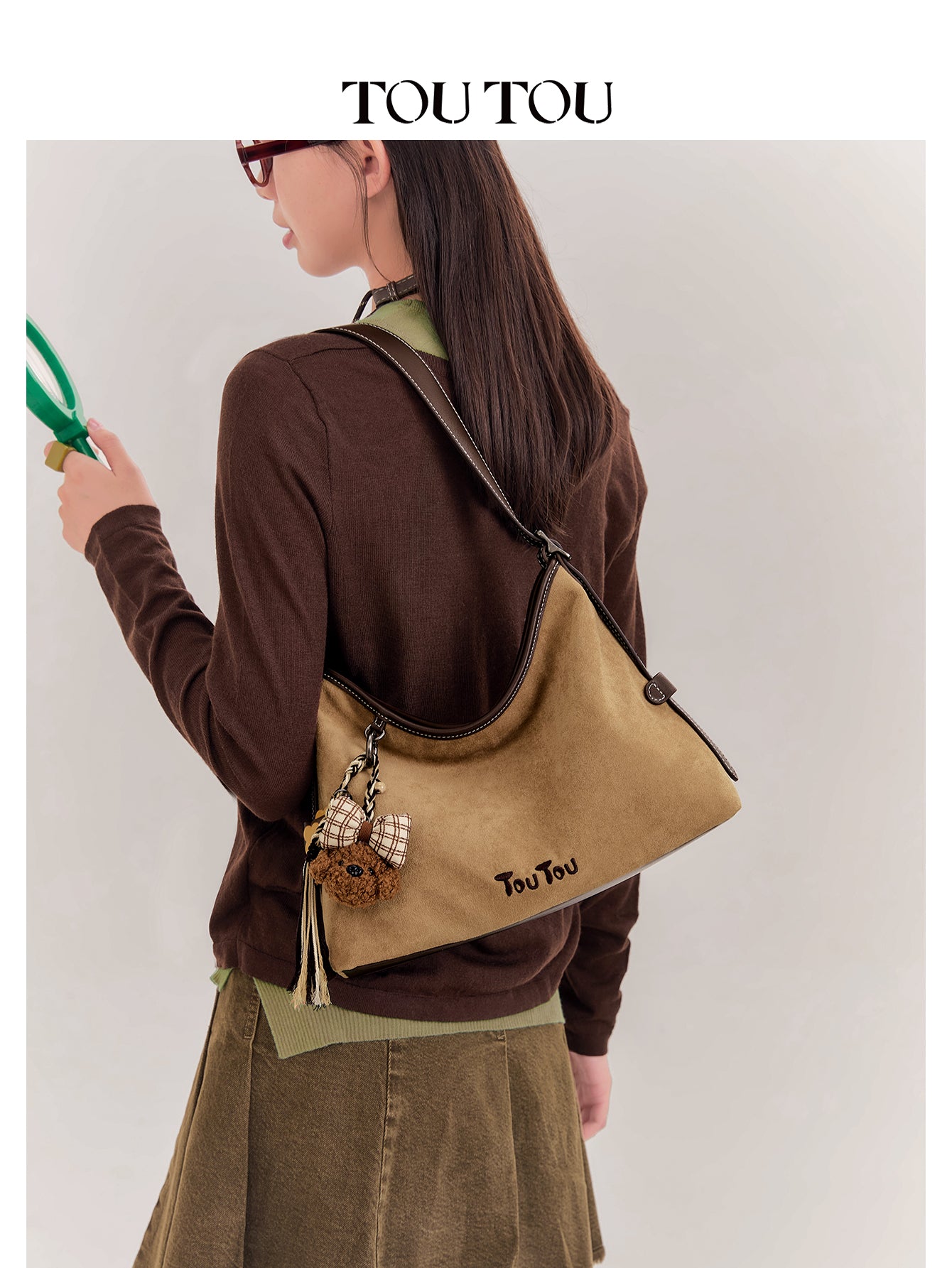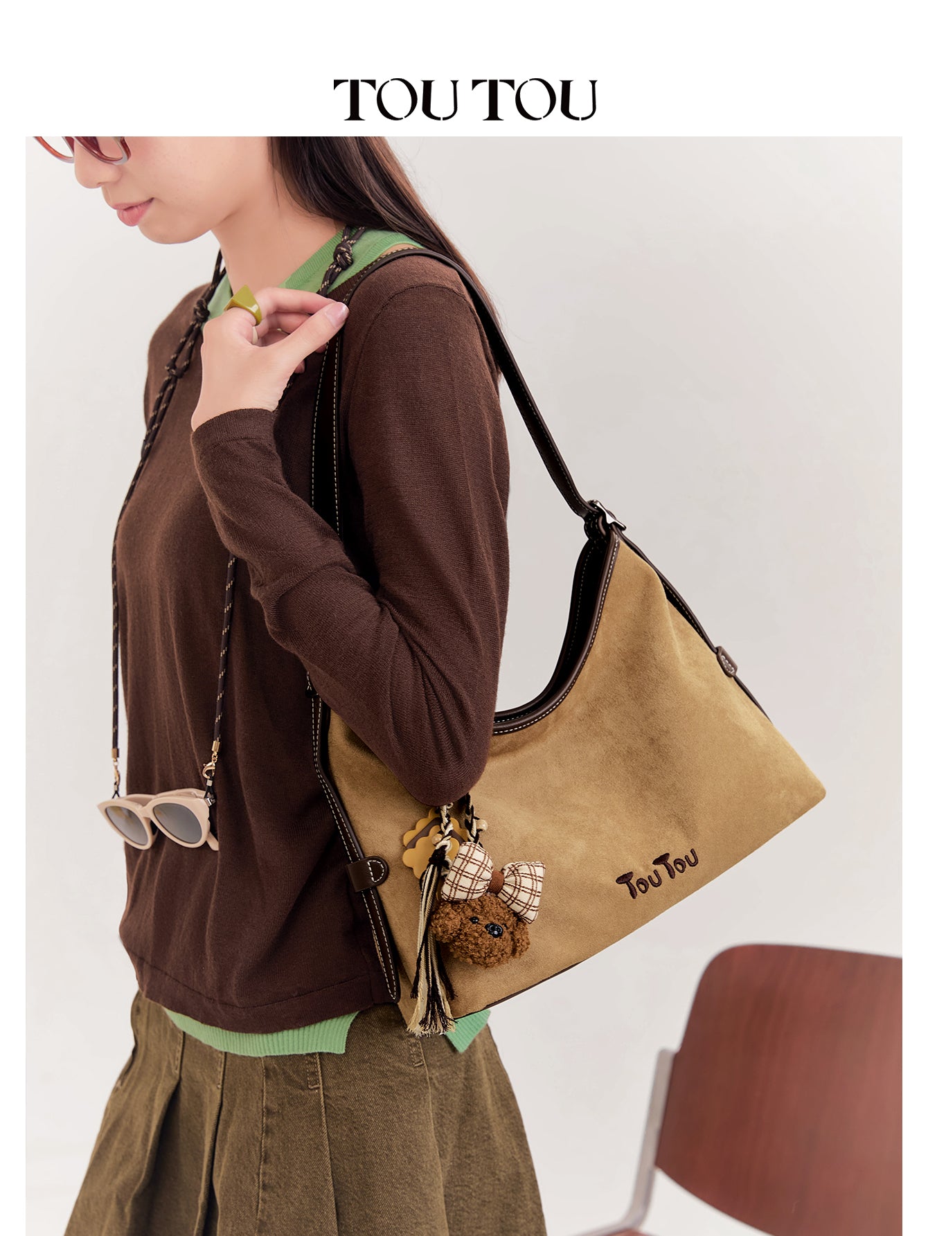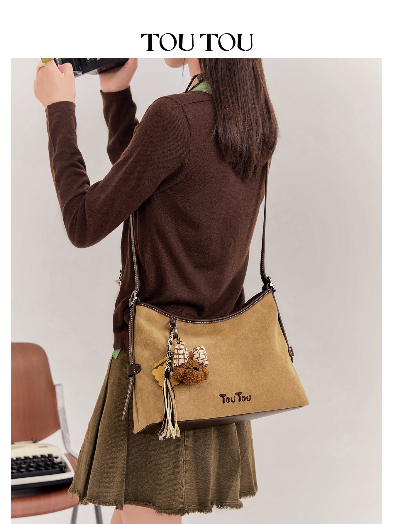 TOUTOU Beige Hobo Bag with Plush Bear Pendant: Retro & Playful