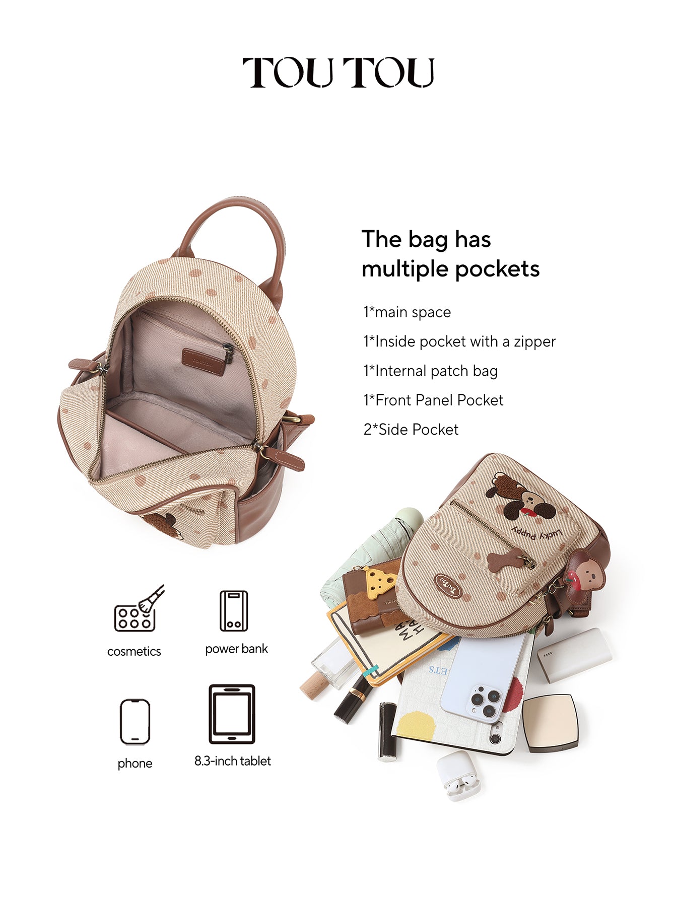 TOUTOU Cartoon Puppy Mini Backpack for Women - Polka Dot Design with Adjustable Strap & Multiple Pockets