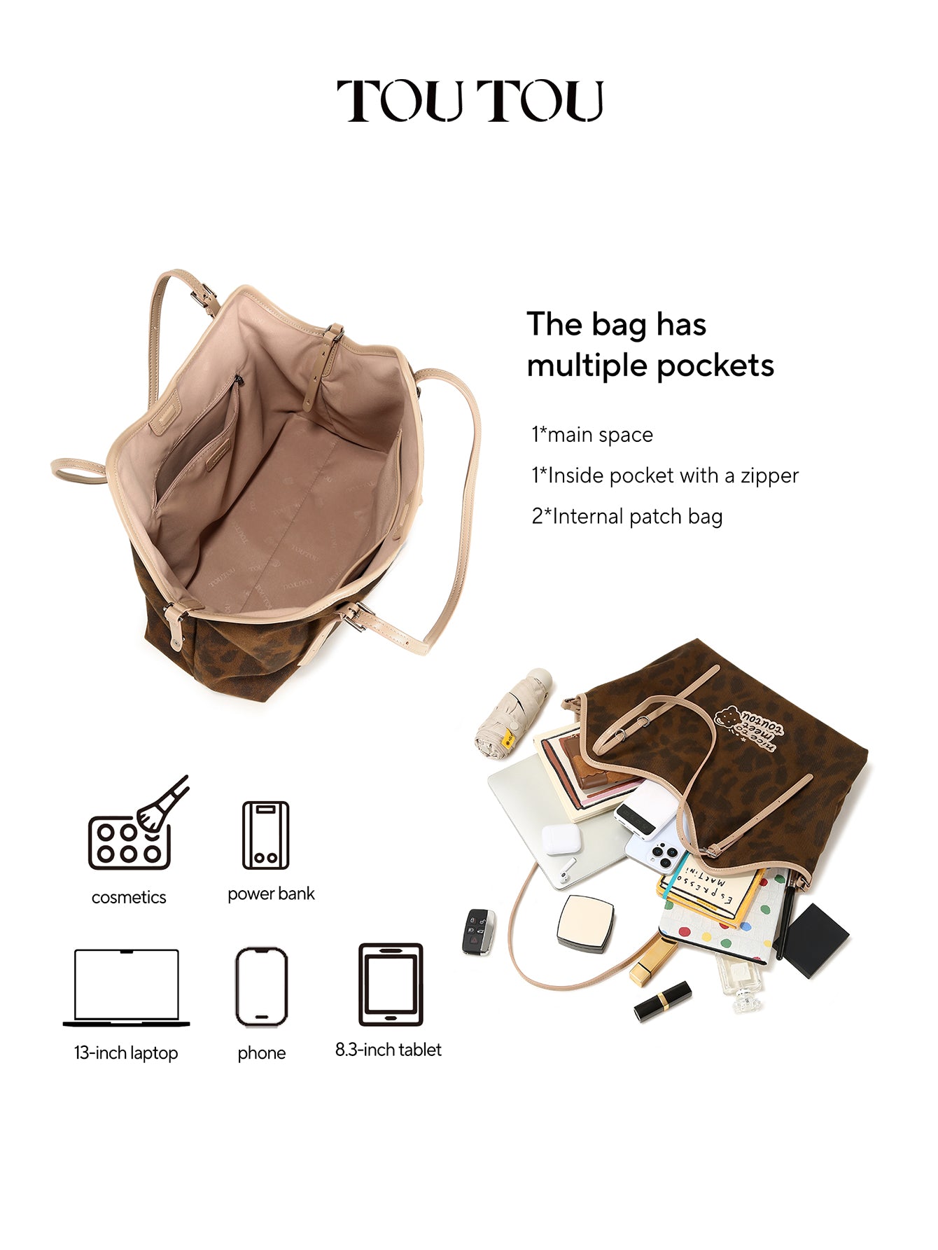 TOUTOU Leopard Print Tote Bag with “Nice to Meet Toutou” Embroidery - Spacious Shoulder Bag for Daily Use (Fits 13" Laptop)